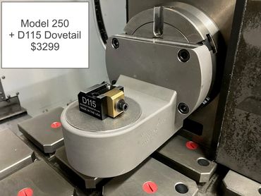 The Model 250 will quickly mount and set up on your 4th axis giving you 5 axis indexing to all sides with 1 axis being manually indexed. The fixture is sealed against coolant and chips and will index at 45-degree increments. It comes standard with a Flat patter that is drilled for the D115 and D05125 fixture that are sold separately. Other options include the DSM double dovetail fixture that is symmetric and simple in design to easily center your stock material. The bottom of your stock is at center line of the 4th axis keeping it low and rigid. Perfect for parts up to 4 1/2" cubed. Also available is a DianJin self-centering vise. I never thought I would sell something that was not made in the USA but this little vise is perfect for a Model 250 fixture.